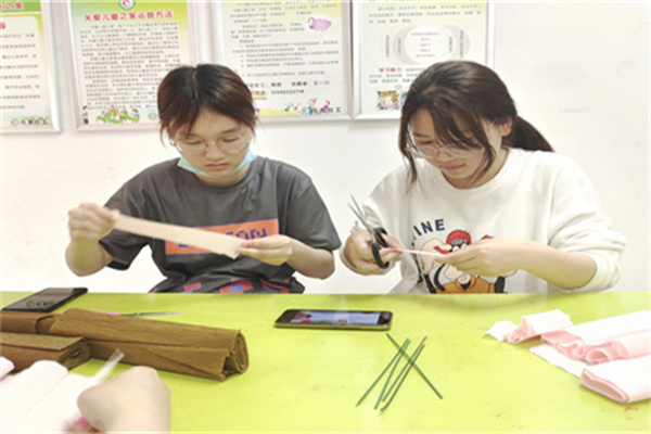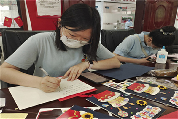 活动伊始,社区工作人员有序分发制作材料,数统院志愿者通过观看视频的方式学习制作康乃馨,他们运用剪刀将皱纹纸剪裁成花瓣的形状,并将其粘贴到对应位置,再依次制作花蕊及花柄,最后精心挑选出其中30朵康乃馨赠予老人。同时,志愿者们制作生日贺卡,手写生日寄语,统一分装生日礼物,传递爱与祝福,获得了社区工作人员的认可。