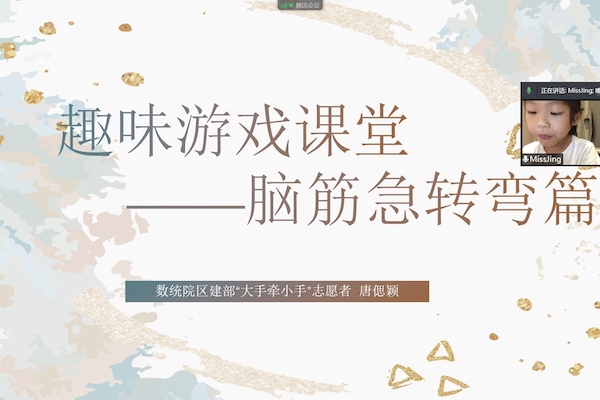 线上云课堂,千里传温情,数统院志愿者们秉持“以学生为中心”的原则,利用网络课程平台的优势,精心准备了脑筋急转弯、语文作文辅导、字母拼读学习等趣味课程。在脑筋急转弯游戏中,志愿者与小朋友协同闯关,开发逻辑思维,携手“云端”,学会换位思考,激发逻辑推理的思维能力,共同创造趣味精彩的云课堂。