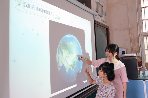 活动伊始,实践团成员王梁美子以太阳东升西落、四季更替等生活现象为例,介绍了地理的概念。通过各类地图的展示与讲解,她带领学生认识地球,感知中国,了解自然。互动环节,王梁美子展示地图并提出相关问题,让学生上台结合地图进行回答。