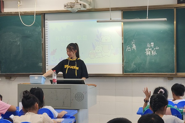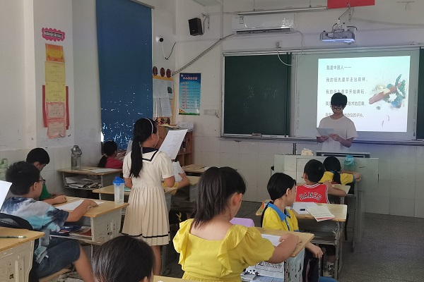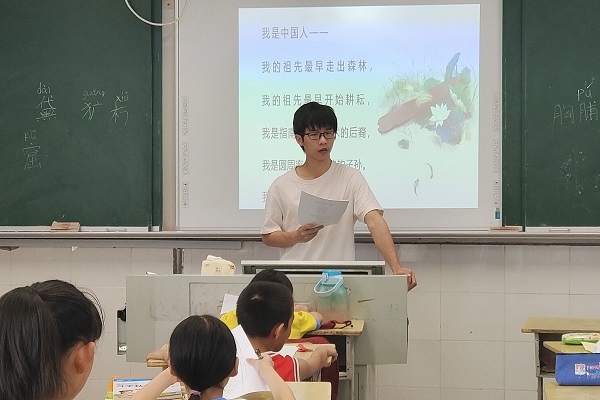 (通讯员 赵莫丽 温海青 谷婷)7月11日下午,数学与统计学院(以下简称“数统院”)“师闪志风”暑期社会实践团组织学生开展爱国主题朗诵课,朗诵内容是诗歌《我骄傲,我是中国人》。此次课程由实践团成员谷婷和曾楚尧组织开展,谷婷负责三年级学生的课程,曾楚尧负责四、五年级的课程,之后三个年级将合作准备诗朗诵节目。