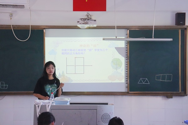为激起学生的学习兴趣,两位实践团成员以打谜语的形式引出“火柴棒游戏”,介绍如何用火柴棒拼出0到9共10位数字,并为学生示范移动一根火柴棒变换式子使等式成立,鼓励学生举一反三移动火柴棒摆出正确的算式。同时,两位实践团成员启发学生从数字联想到图形,以由火柴棒拼出的花朵、小狗、鱼等日常生活中的基础图形为例,两位实践团成员移动几根火柴棒来变换图形的样式,由此引导学生通过移动火柴棒拼出不同的图形。此外,两位实践团成员讲解了特殊的“田”字,它能产生多种变化。
