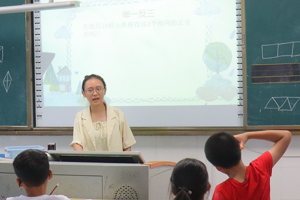 (通讯员 黄萌宇 谷婷)为训练学生的空间思维能力,7月12日上午,数学与统计学院(以下简称“数统院”)“师闪志风”暑期社会实践团于双湖小学开展“火柴棒游戏”益智数学教学活动,此次活动由实践团成员唐偲颖和程南燕组织开展,唐偲颖负责三年级的课程,程南燕负责四、五年级的课程。