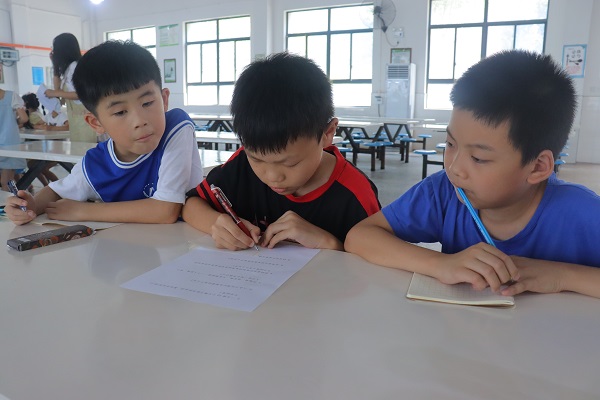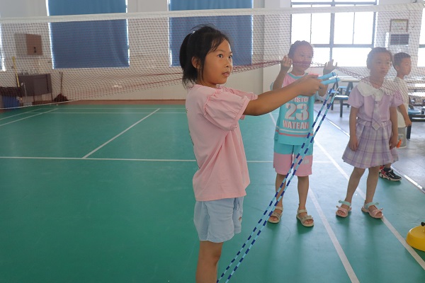 实践团成员于校内羽毛球场、食堂、大教学楼一楼教室、三至五年级各班教室设置了形式多样、难度不同的闯关内容,闯关内容依次为跳绳、脑筋急转弯、趣味题、语数外试题。各年级采用错峰闯关的方式进行答题。跳绳的规则为小组派出一人进行一分钟计数跳,共有两次机会。为维护小组荣誉,学生不论自己是否擅长跳绳,都积极参与其中。在脑筋急转弯关卡,学生三人一组,由一人负责主要答题,其余二人给出参考意见,合作完成答题。语数外试题关卡则是将夏令营上课学习的内容与限时答题闯关结合在一起,以多样的形式检验学生学习效果。