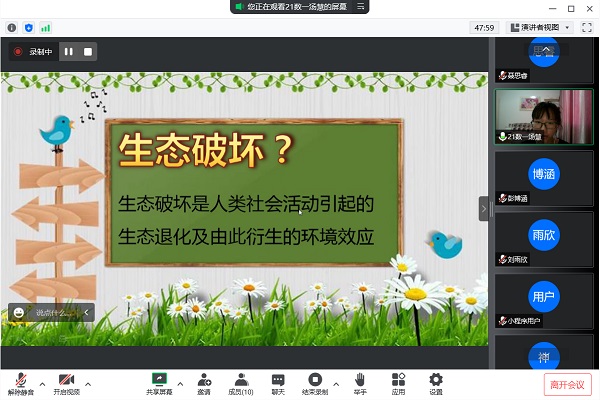汤慧由海洋生态遭到破坏的视频引入主题,讲解生态破坏的含义,向同学们列举生活中常见的破坏生态的行为并指出生态破坏会加速生物灭绝。她表示,目前已有许多动物被纳入濒危动物名单,比如白犀牛,白鳍豚,白头叶猴。此外,她告诉同学们破坏生态不仅加速了生物灭绝,还导致了植被破坏,引起土地沙漠化、荒漠化,影响人类的生存与发展。因此,她呼吁同学们学习绿色文明理念和生态文明理念,养成健康绿色的生活方式,维护我们共同的家园。