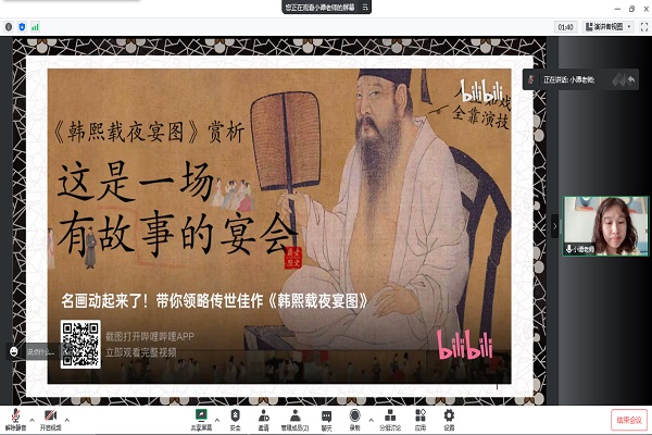 谭竞以中国历史和中国艺术史上饶有名气的《韩熙载夜宴图》为切入点,通过带领同学们品鉴《韩熙载夜宴图》开展此次的艺术史课。课程中,谭竞将绘画与历史结合起来,通过播放讲解视频,阅读文字资料等方式向同学们简单介绍中国绘画的历程和作用。课程最后,谭竞从《韩熙载夜宴图》的绘制缘由、画面细节和整体效果上分析其精妙。