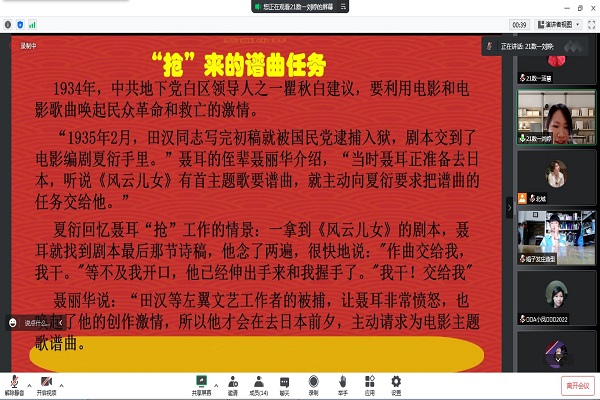 刘婷通过给同学们播放中华人民共和国国歌——《义勇军进行曲》引入课程。刘婷主要向同学们介绍了国歌诞生过程中“聂耳‘抢’谱曲任务”、“几度修改的词和曲”、“成为传世‘绝唱’”、“成为国歌”的故事。刘婷表示,“爱国”是根植于每个中国人血脉里的感情,尊重国歌、高唱国歌是我们爱国最基本的表达。课程最后,刘婷带领学生欣赏舞台剧《国歌》。