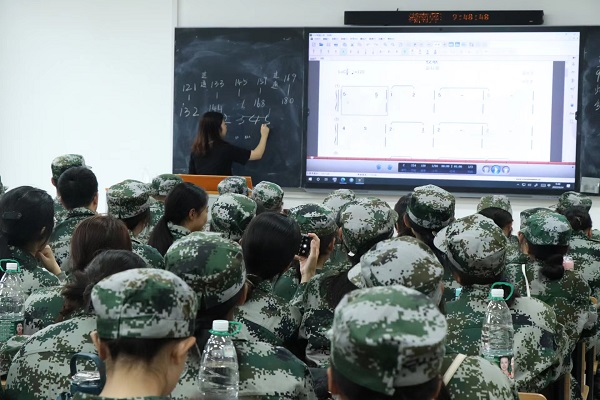 合唱团成员依次进入综合楼302教室,利用多媒体播放《强军战歌》。有声乐基础的同学上台指导,基础较弱的同学则努力跟上节奏,综合楼里阵阵音浪,凸显出新生们自信阳光的青春面貌。