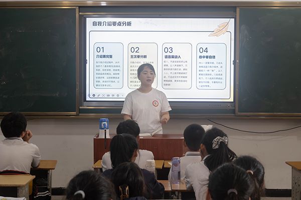 此次课程以课堂展示的形式展开,鼓励同学们走上讲台,进行自我介绍。通过趣味情景模拟拉进了老师与学生的距离。在易烨的鼓励下,多名同学进行了自我介绍和交流互动。通过激发学生对口语表达的热情,有助于孩子们增强自信心、在生活中勇于表达自己。