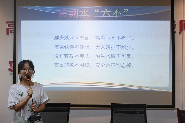李丽飞从溺水安全隐患、溺水自救方法、他人溺水的急救方法三个方面向同学们普及防溺水相关知识。她通过分析实际案例向同学们展示了溺水原因,以此导入相关防溺水知识。课堂最后,李丽飞带领全体同学共同朗读防溺水“六不”和“四牢记”口诀,并向同学们再次强调了增强防溺水安全意识的重要性。