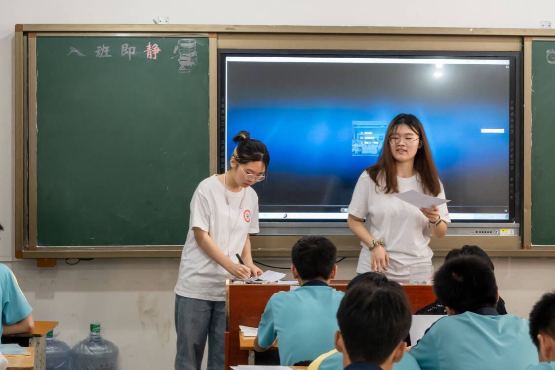 队歌《五中支教的日子》改编自歌曲《北京东路的日子》,改编的歌词内容来源于实践团举行的活动与成员真实的感受。课前,戴文惠给学生发放打印的歌词,播放录制好的队歌,以便学生学习。通过学生集体清唱,戴文惠与赵欣彤大致了解学生的节奏及音准的错误,并采取分段教学的方法,逐步进行示范,学生听后自行进行练习。随后,戴文惠、赵欣彤与学生一起合唱,完成了队歌的录制。此外,赵欣彤鼓励学生积极报名参与汇报演出的合唱节目。