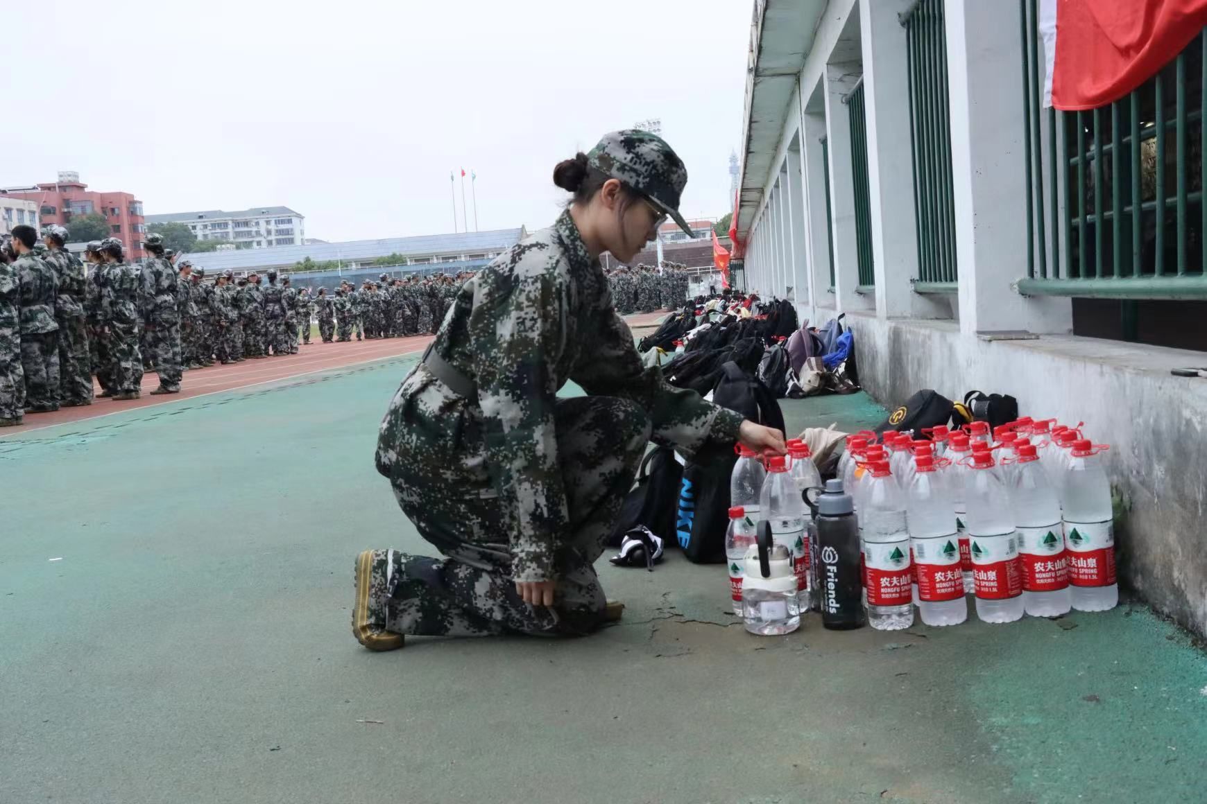 教官提醒新生,身体是革命的本钱,出现身体不适的同学需及时报告,并且再次强调身体健康的重要性。教官准备了矿泉水、生理盐水、葡萄糖,供新生使用。