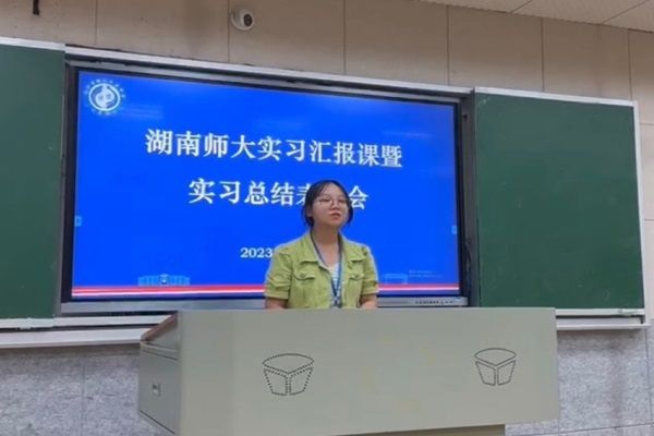 随后,实习队代表伍亦缘向领导和老师们展示实习队成果。伍亦缘从实习队构成、特色活动、教学工作、班主任工作等方面介绍了实习队在雅礼十五中的实习工作。