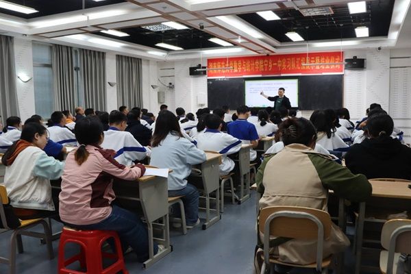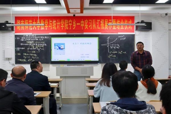 (通讯员 罗毓伟 覃雨欣 管宏娟)为检验数统院教育实习生实习成果,提高实习生教学实践能力,11月9日上午,数学与统计学院(以下简称“数统院”)赴宁乡市第一高级中学(以下简称“宁乡一中”)实习队于宁乡一中信息楼一楼录播室开展汇报课展示暨结业仪式。数统院党委专职组织员覃志斌、数学系副主任兼实习队领队老师袁智强、实习队指导老师卿如梅,宁乡一中副校长唐新阳、党建人事科科长宋仁辉、高一年级主任喻中权、高一年级数学备课组组长杨国章、部分数学实习指导老师以及全体实习生参加了此次活动。队员彭俊祺担任汇报课授课教师,唐新阳担任活动主持人。