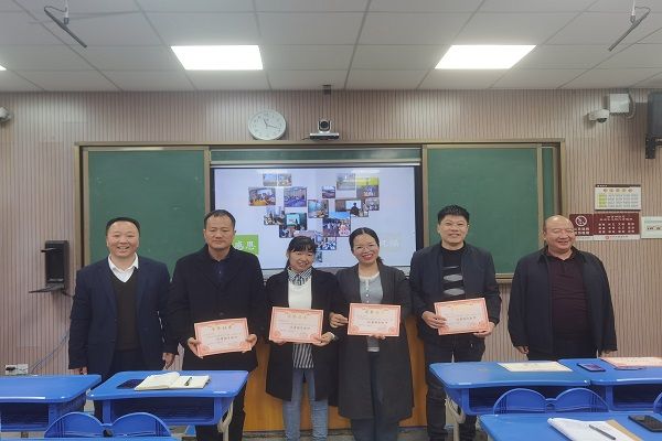 段剑东、戴飒英为优秀实习队员进行颁奖,袁智强为紫金中学优秀实习指导老师颁发证书并合影留念。