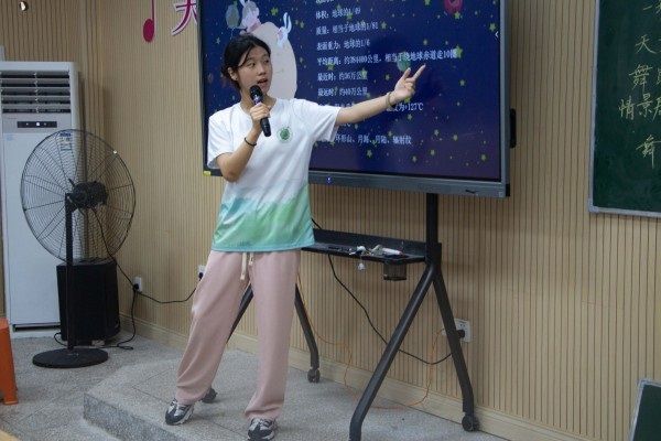 此次课程分为“介绍月球”、“月球的表面特征介绍”和“中国探月梦的介绍”三个部分。课程伊始,杜明镜从月球的起源讲起,通过图文资料和视频片段,杜明镜揭示了月球的形成过程以及月球与地球密不可分的联系。这一环节让学生们对月球有了直观的认识,激发了他们对天文科学的热情。
