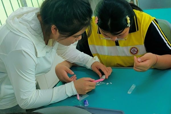 课程主要围绕印章基本常识、印章雕刻和成果展示三部分展开。印章基本常识的介绍环节中,周姚玲向学生们具体介绍了印章的来源、分类及作用,学生们也了解到了传统文化中的篆刻艺术。在讲解完印章的制作流程及注意事项后,周姚玲给学生们分发材料,并带领学生们动手实践。这一环节中,学生遇见的问题周姚玲也给出了具体的解答,并在后续印章成果展示环节中给效果不符合预期的印章给出了改进意见。