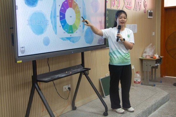 课程包括美术配色、摄影构图、动手实践以及制作分享四个环节,旨在帮助学生们了解颜色的搭配和摄影技巧,锻炼学生们的实践能力和表达能力。课程伊始,陈佳利通过绘画作品,向学生们讲解色彩搭配的基本原理与技巧。学生们认识到色彩不仅是视觉的享受,更是情感的传递。在摄影构图环节中,陈佳利通过赏析经典摄影作品,讲解了构图的基本原则,如三分法构图、对称构图、框架构图等,并现场指导学生们运用这些法则进行摄影。