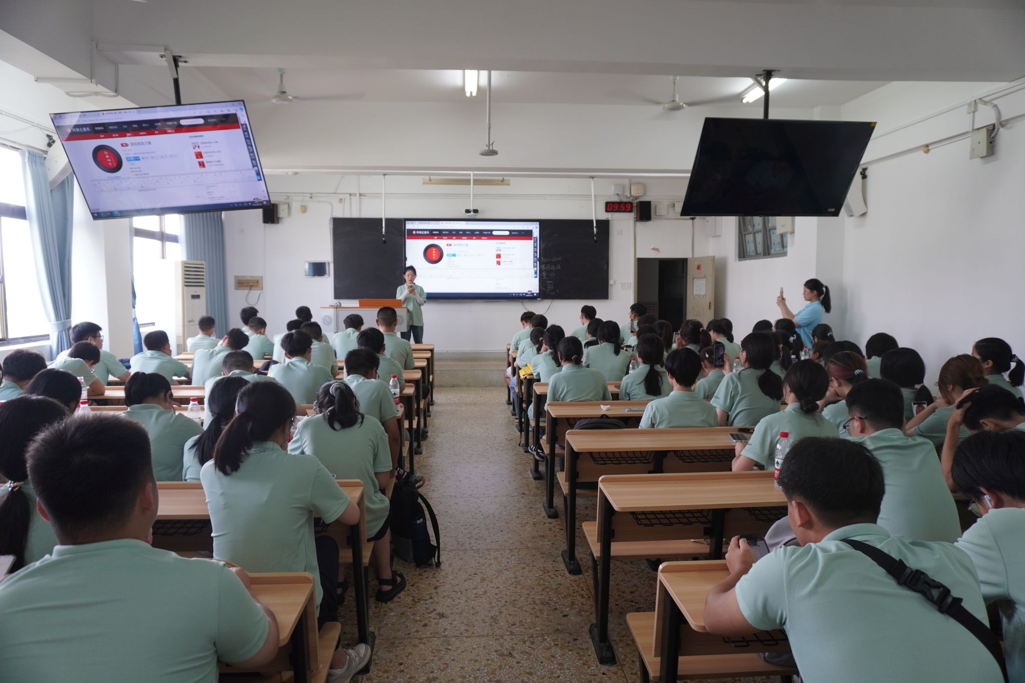 班会上,各班通过多种活动方式,鼓励新生参与选拔活动。首先各班负责人向同学们介绍了合唱团选拔的制度与要求,部分班级采取了接歌选拔制度,同学们轮流接唱同一首歌来展示自我。此外还有部分班级采取了单人演唱制度,由同学们自发上台演唱,曲目包括《团结就是力量》、《打靶归来》、《强军战歌》等。这一环节充分考验了候选人的演唱水平及临场发挥能力,展示了新生的个人风采。