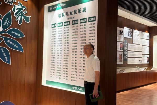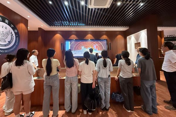 会后,袁闵湘带领实习队参观培英中学云城校区校史馆,感受学校百余年来的历史与文化。袁闵湘重点介绍了培英中学独具特色的级社传承——“培英儿女世系表”。队员们参观了培英中学的建校历程、荣誉成就,并观看学校宣传片,初步理解了培英中学“世界入怀、培育英才”的办学理念。