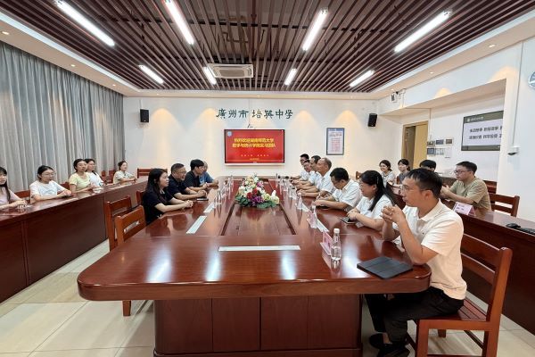 (通讯员 蒲佳莹 黄晴)9月8日下午,数学与统计学院(以下简称“数统院”)赴广州培英中学实习队一行15人抵达广州市培英中学云城校区,与该校共同举办实习见面会。我校数统院党委副书记涂榉耀、教育教研室主任蒋培杰、实习队指导老师唐敏卫、2022级辅导员李师澳与广州培英中学党委书记袁闵湘、副校长何善波等领导参与见面会。