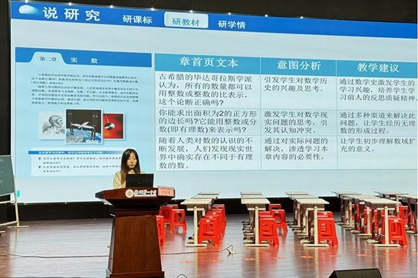 活动内容包括说课展示、教学片段演示和专题讲座。陈莉萍就七年级《认识方程》进行说课,梁梓君演示了八年级《认识实数》实际教学,李佳雯介绍了章首课教学设计方法。顾继玲作了《以促进学生结构化学习能力发展的初中数学教科书设计》专题报告,系统解析新教材如何通过知识结构化促进学生数学思维发展。