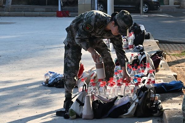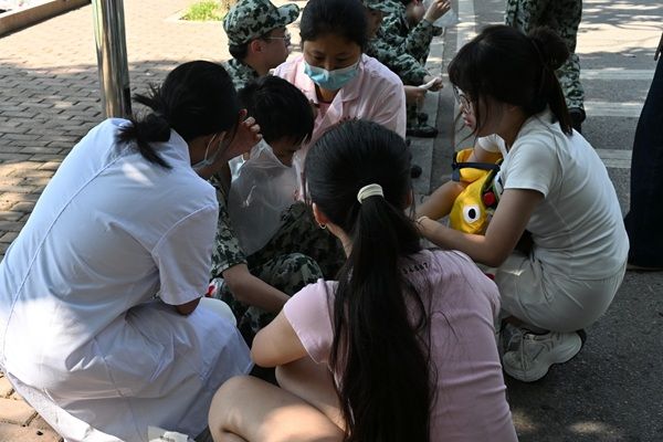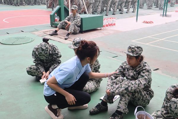 高温天气下的长时间站立十分考验学员们的身体素质,为了应对学生中暑、晕倒等紧急情况,班导、后勤人员准备了糖果、藿香正气水等应急物资。同时,后勤部在篮球场驻扎简易遮阳棚并携带基础的医疗器械,以便及时诊治身体不适的学员。班导作为班级负责人进行一对一关注,有效帮助新生适应军训环境。此外,军训管理人员专门设立伤病连以安置有特殊情况的新生们。
