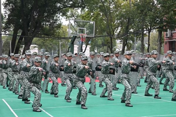 训练场地上,第一方阵进行分列式连贯演练。新生将正步走、齐步走及原地踏步等队列动作进行连贯练习,反复打磨动作力度、节奏与排面整齐度。同时,第二方阵对已学的格斗术进行成套复习。同学们动作标准,为增强表演观赏性与团队默契,着力提升动作力度与整体气势。此外,警棍盾牌方阵亦开展综合复习。队员们熟练运用此前掌握的警棍盾牌技巧,完成全部战术动作,侧重强化队伍整体协调性与动作一致性,以呈现完整的表演效果。训练期间,教官们与2025级辅导员许劲晗全程跟进,针对演练细节进行现场指导与优化。各方阵成员力求通过精益求精的反复合练,达到最佳的集体展示效果。