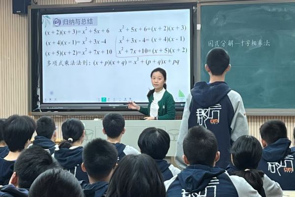 左馨雨以“用十字相乘法分解因式”为主题进行公开课教学。通过例题设计与讲练结合,她帮助学生逐步掌握十字相乘法的基本步骤与应用场景,展现出扎实的教学功底与课堂驾驭能力。此外,左馨雨围绕课程的教学设计思路与实施策略进行了简要说明,进一步阐述了教学目标的设定依据与各环节的教学意图。