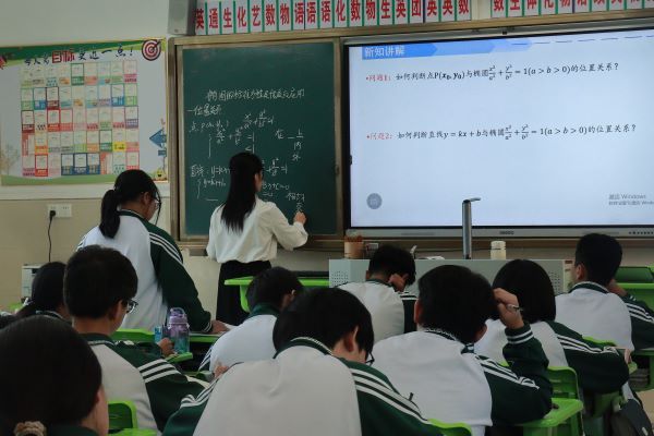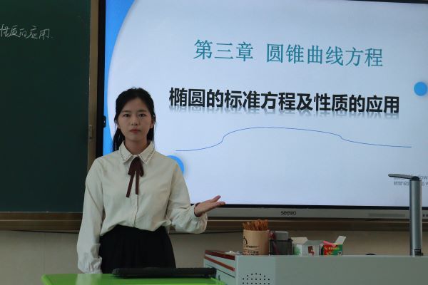 黄晴以“椭圆的标准方程及性质的应用”为主题进行公开课教学。课堂上,她创新采用 “圆” 的类比教学法,阐释点、直线与椭圆的位置关系,逐步推导相交弦长相关知识点。此外,黄晴在教学过程中,灵活运用 Geogebra 这一现代教育技术工具,为课堂教学注入了科技活力。
