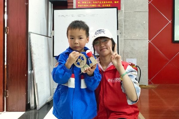 志愿者和小朋友展示制作的发电机