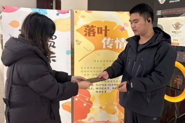 (通讯员 葛小颂 王雅一然 翟欣晨)12月15日至21日,为践行志愿服务精神,倡导环保理念,数学与统计学院(以下简称“数统院”)学生社团管理服务中心绿色志愿者协会(以下简称“绿协”)于格物楼和桃花坪食堂前坪举办“锋果传情·志愿同行”和“落叶传情”志愿活动。