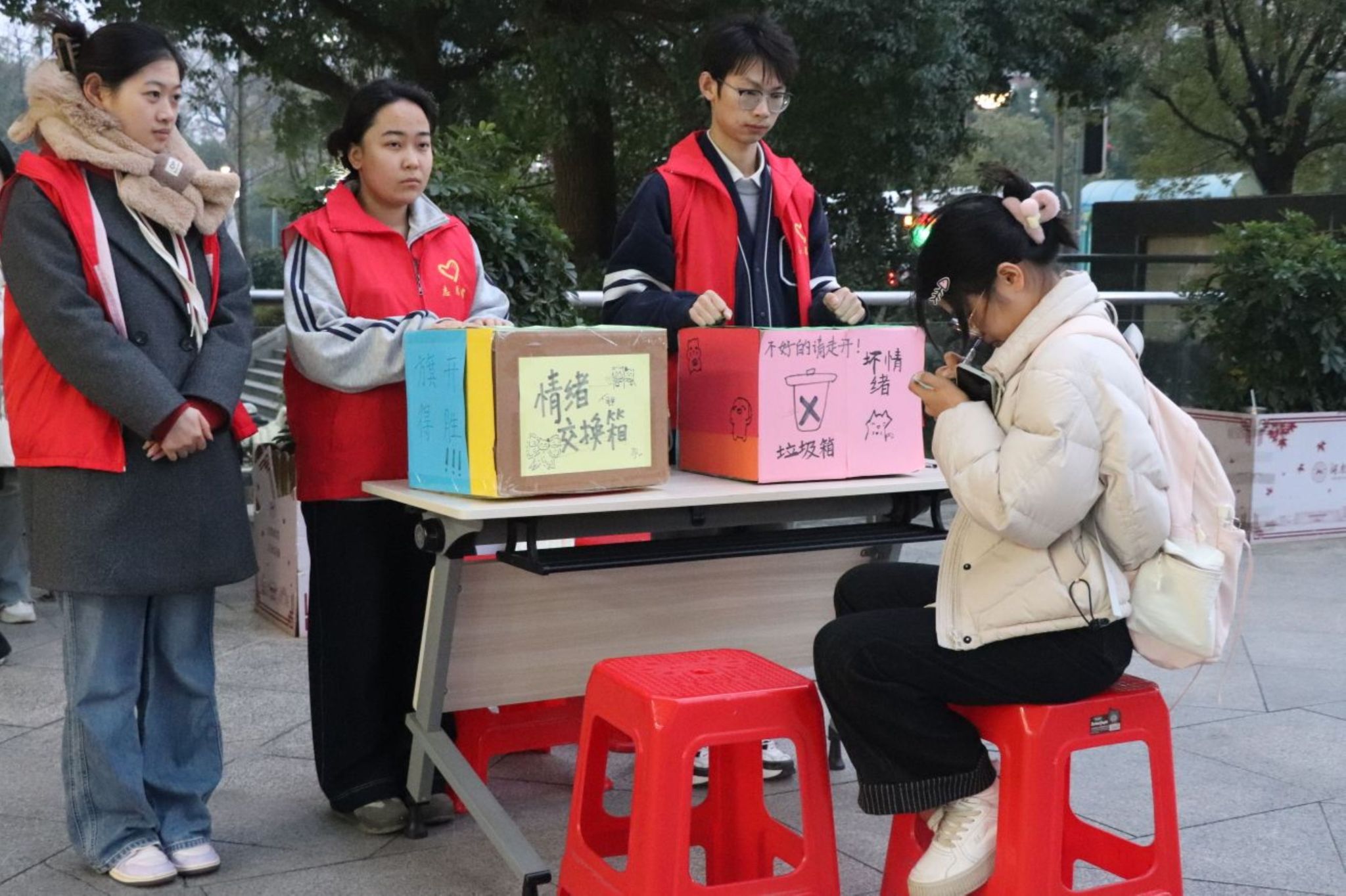 学生将烦恼和焦虑写在便利贴上并投入“坏情绪垃圾箱”