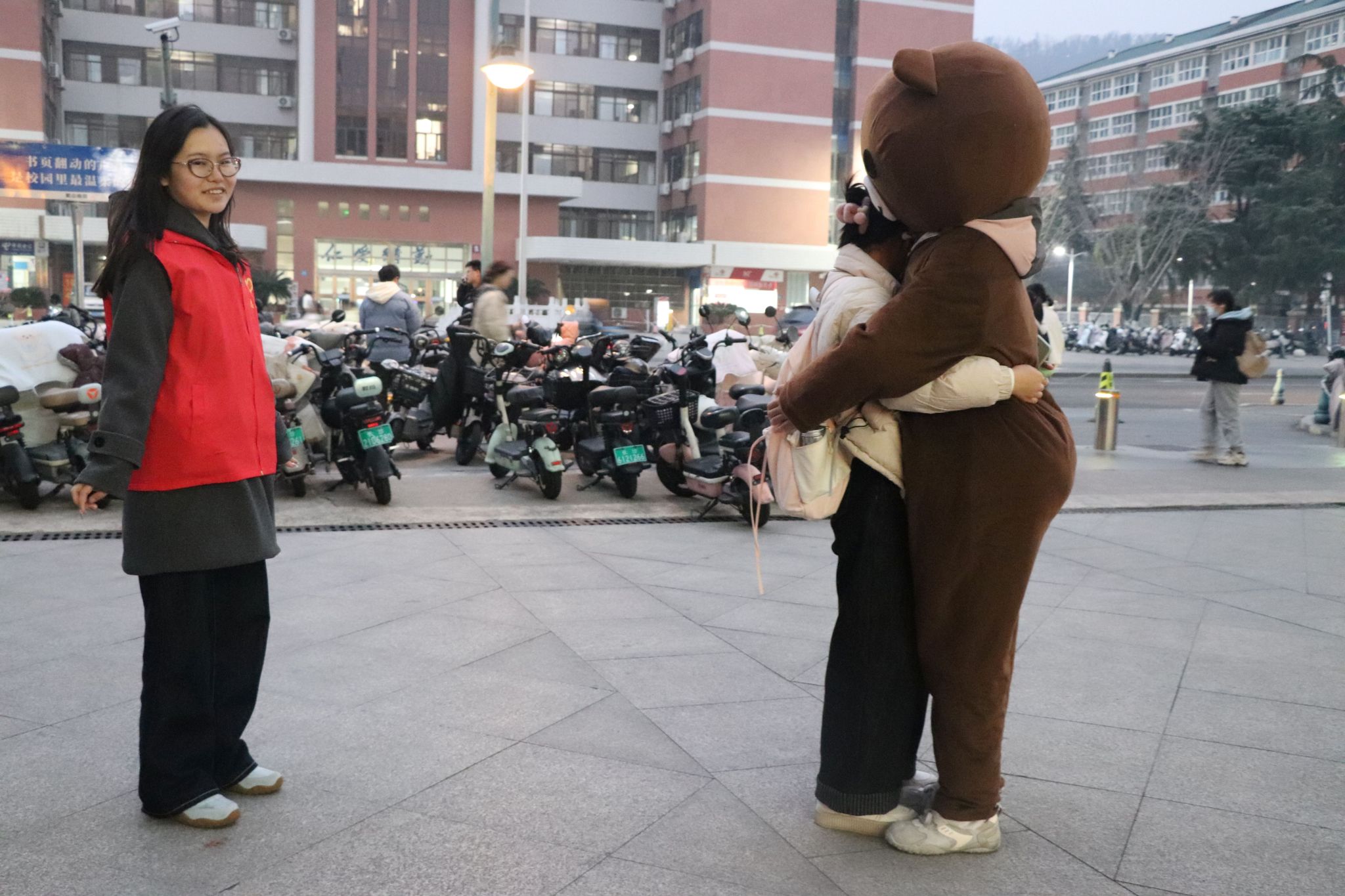 学生与志愿熊拥抱