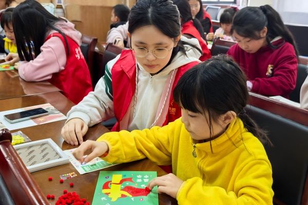 志愿者和小朋友进行手工制作