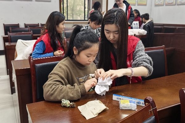 禁毒知识宣讲结束后,志愿者为小朋友们分发盆栽、营养土及多肉植株,随后双方分工合作,配合默契。小朋友负责将花盆底部铺垫纸巾,志愿者们则负责倒入营养土,待小朋友们将多肉植入土中后,两人一同压实土壤并适量浇水。在志愿者与小朋友的共同努力下,一盆盆多肉盆栽栽种完成。