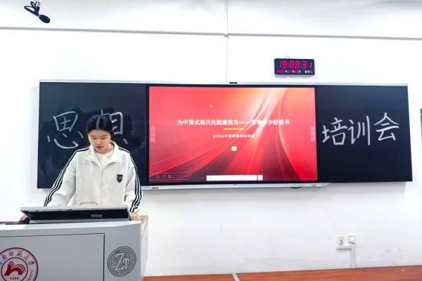 (通讯员 陈辉 翟欣晨)为积极响应全民阅读号召,引导青年学生在中国式现代化建设中挺膺担当,4月3日晚,数学与统计学院(以下简称“数统院”)学生会办公室于桃花坪校区实训楼102教室开展春季思想培训会,2024级统计班宋怡萱担任此次培训会的主讲人。