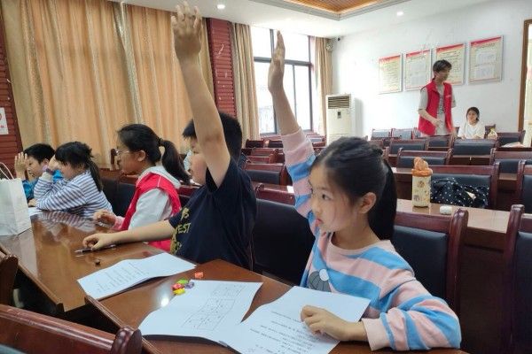 在熟悉游戏规则、掌握基础数学知识后,趣味答题环节正式启动。志愿者提出问题,小朋友们思考、举手并尝试作答。遇到疑难问题时,部分小朋友向身旁的志愿者请教,并得到了解答。习题任务环节中,孩子们先独立解题,再与同伴交流,尝试从不同角度分析问题,共同寻找解决方法。